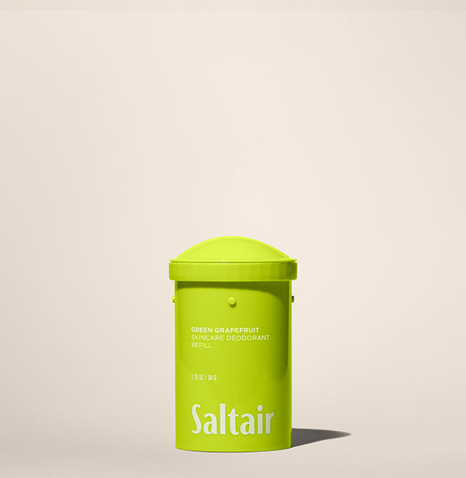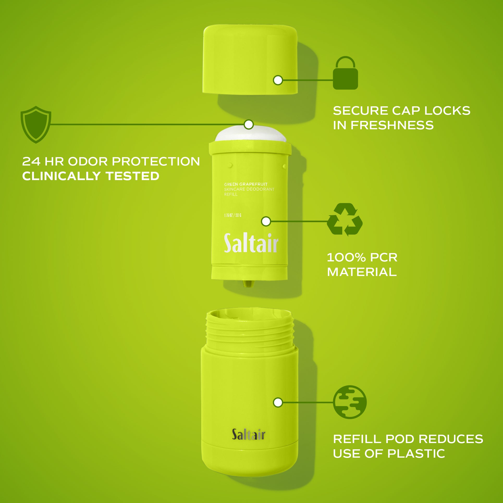 Our next-generation. Green Grapefruit refillable skincare deodorant utilizes skin activated acidification to keep odor at bay. Formulated with BHA. zinc ricinoleate. nourishing oils and algae to help neutralize odor. this product keeps you feeling fresh for long-lasting performance.