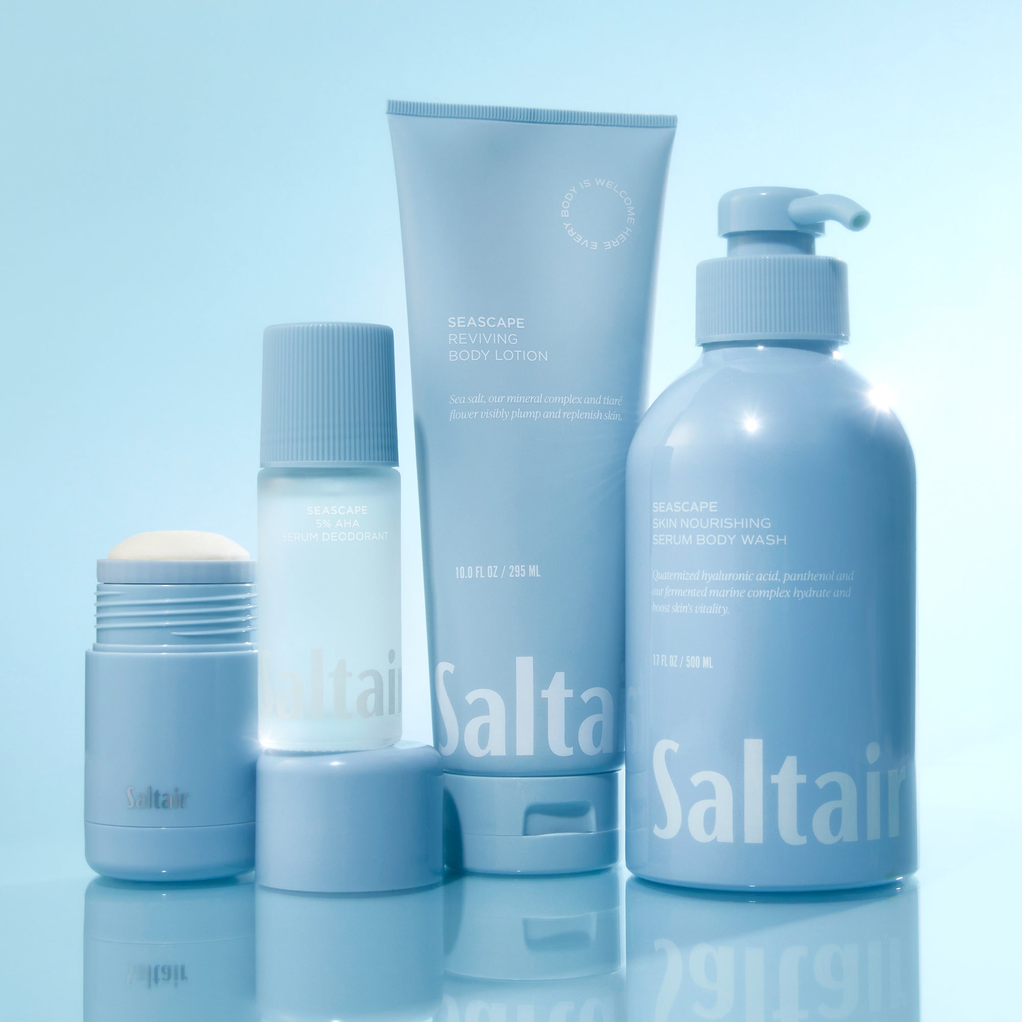 Our skin reviving body wash nourishes. smooths. and visibly tones skin. Formulated with biodegradable cleansing agents. this body cleanser is made with quaternized hyaluronic acid that provides long-lasting hydration. even after rinse off. Panthenol. polysaccharides and our fermented marine complex boost skin’s vitality while visibly smoothing and toning. Skin is left soft. smooth. deeply nourished and lightly fragranced. Developed for all skin types and suitable for daily use.